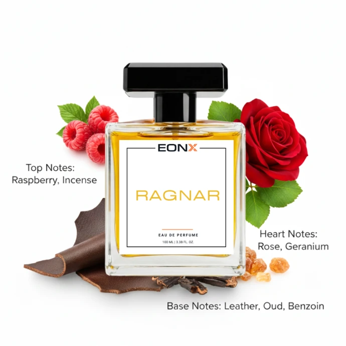 Ragnar is crafted for the warrior spirit — bold, smoky, irresistibly mysterious. The unique blend of raspberry and incense creates a dark, intriguing opening. Rose and geranium add richness at the core, while leather, oud, and benzoin deliver a deep, smoky base that lingers for hours.